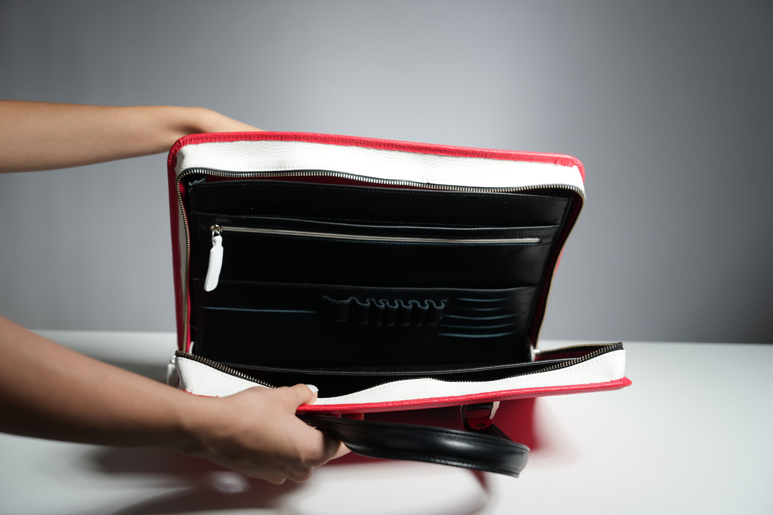 Torba za laptop radjena od prirodne kože. Unutrašnjost torbe je sa pregradama za laptop, punjač, dokumente i ostale neophodne stvari. Prefinjen dizajn torbe upotpunjen je kožnom ručkom i kaišem sa našim logom.