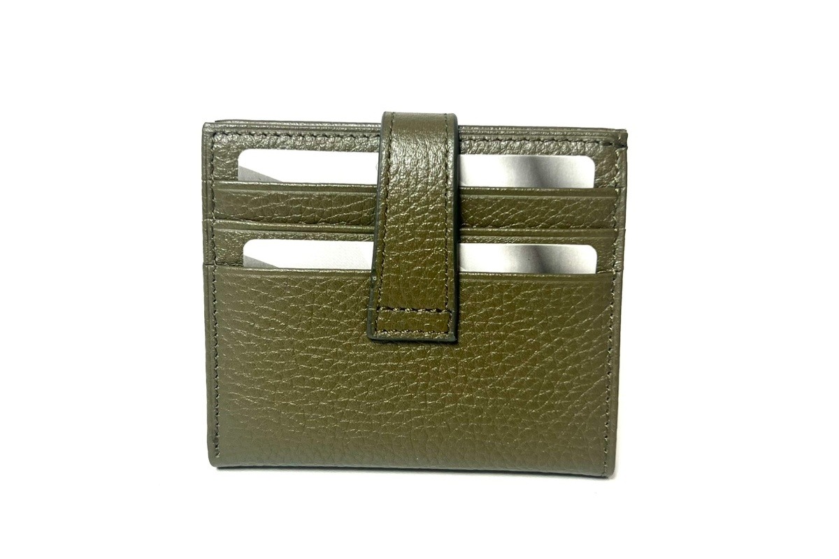 Maslinasto zeleni novčanik izradjen od prirodne kože. Ima kompaktnu unutrašnjost sa pregradama za kartice i novac. Logo je utisnut sa prednje strane.