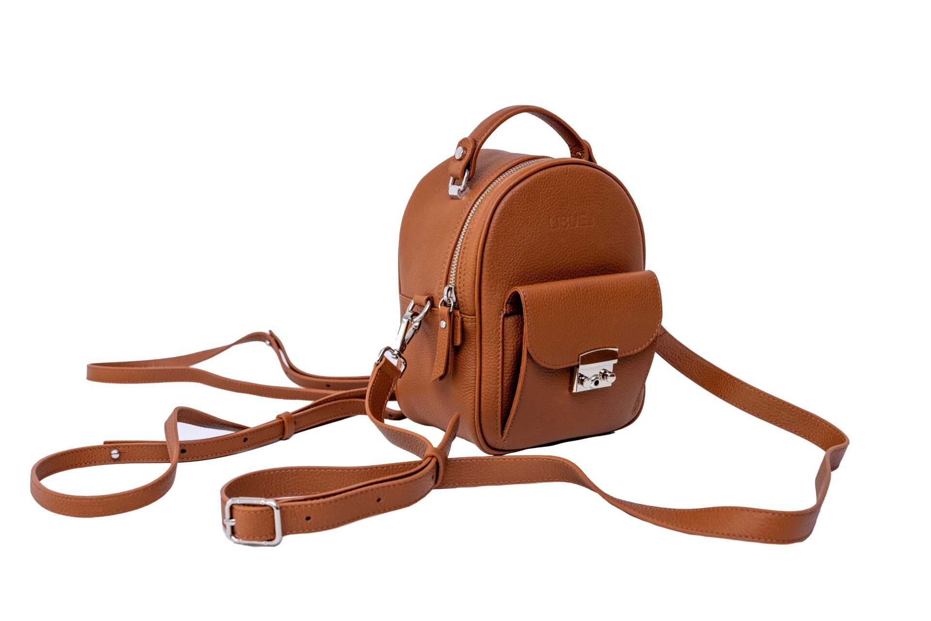 Elegantan mini ranac radjen od čvrste prirodne kože. Sa spoljne strane ranac je upotpunjen malim džepom. Pored osnovnih kaiševa uz ranac dobijate i veliki kaiš za rame pa se ovaj ranac može nositi i kao torba.